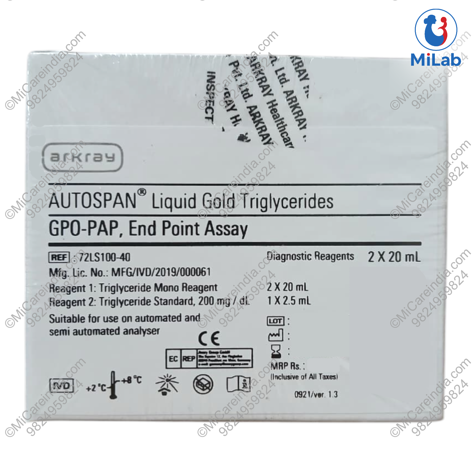 The ARKRAY Triglycerides 2x20ml Kit is a liquid stable, ready-to-use enzymatic colorimetric reagent kit used for the quantitative determination of triglycerides in human serum or plasma. It is part of the AutoSpan Liquid Gold series and is compatible with both semi-automated and fully automated chemistry analysers.